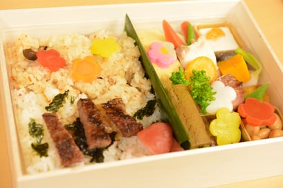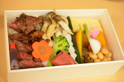 季節の弁当・紀州備長炭炭火A5雌牛ステーキ弁当・A5雌牛牛炭火焼き入り季節弁当・ミニ季節弁当・炭火焼弁当の「定番お弁当」5品は、前日までのご予約で1個から、特別弁当4品は、4日前に10個以上のご予約で承ります。